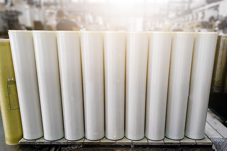 RO膜(Reverse Osmosis membrane:逆浸透膜)は、分子レベルでの分離が可能な緻密な孔を有し、溶解性塩類、無機イオン、有機物、微量有害物質などを高効率に除去します。水に圧力を加えることで浸透圧に逆らって水分子のみを透過させる原理を利用しており、膜ろ過の中でも最も高い除去性能を発揮します。